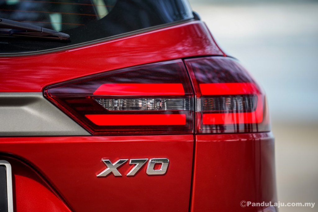 6. Versi Standard didatangkan dengan rim aloi 17 inci bersama tayar bersaiz 225/65, manakala varian Executive (rim 18 inci, tayar 225/60) dan Premium (rim 19 inci, 225/55). Sistem suspensi X70 menggunakan absorber strut Macpherson di depan dan multi-link dengan stabiliser (belakang).