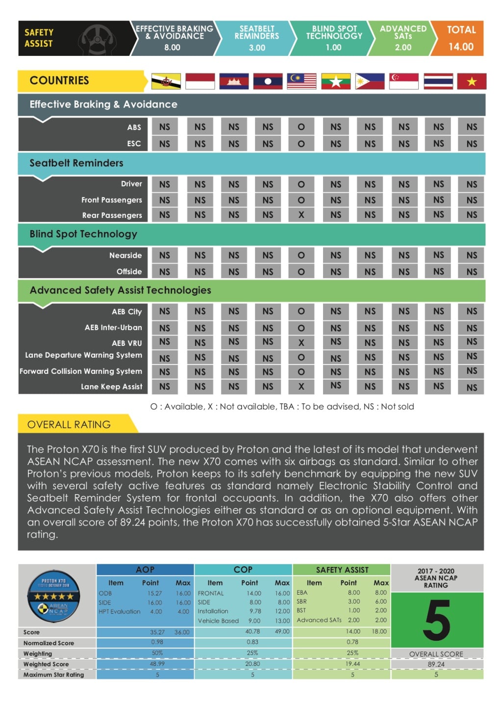 PROTON X70 mendapat rating 5 bintang dalam Program Penilaian Keselamatan Kereta Baharu Asia Tenggara (Asean NCAP). Penarafan diterima itu menjadikan kenderaan utiliti sukan (SUV) Proton tersebut sebagai antara model yang menduduki barisan tertinggi dalam segmen SUV bagi keselamatan penumpang.