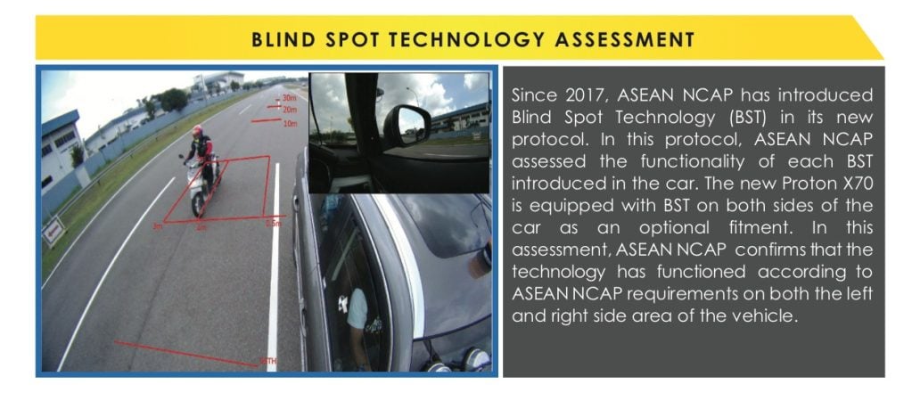 Barisan jurutera dan perekabentuk Proton memberi perhatian kepada setiap butiran dalam memastikan X70 mendapat skor tinggi berdasarkan protokol ujian terkini 2017-2020. Menurut standard baharu Asean NCAP, teknologi bantuan keselamatan turut diambil kira dan dinilai sebanyak 25 peratus daripada skor keseluruhan.