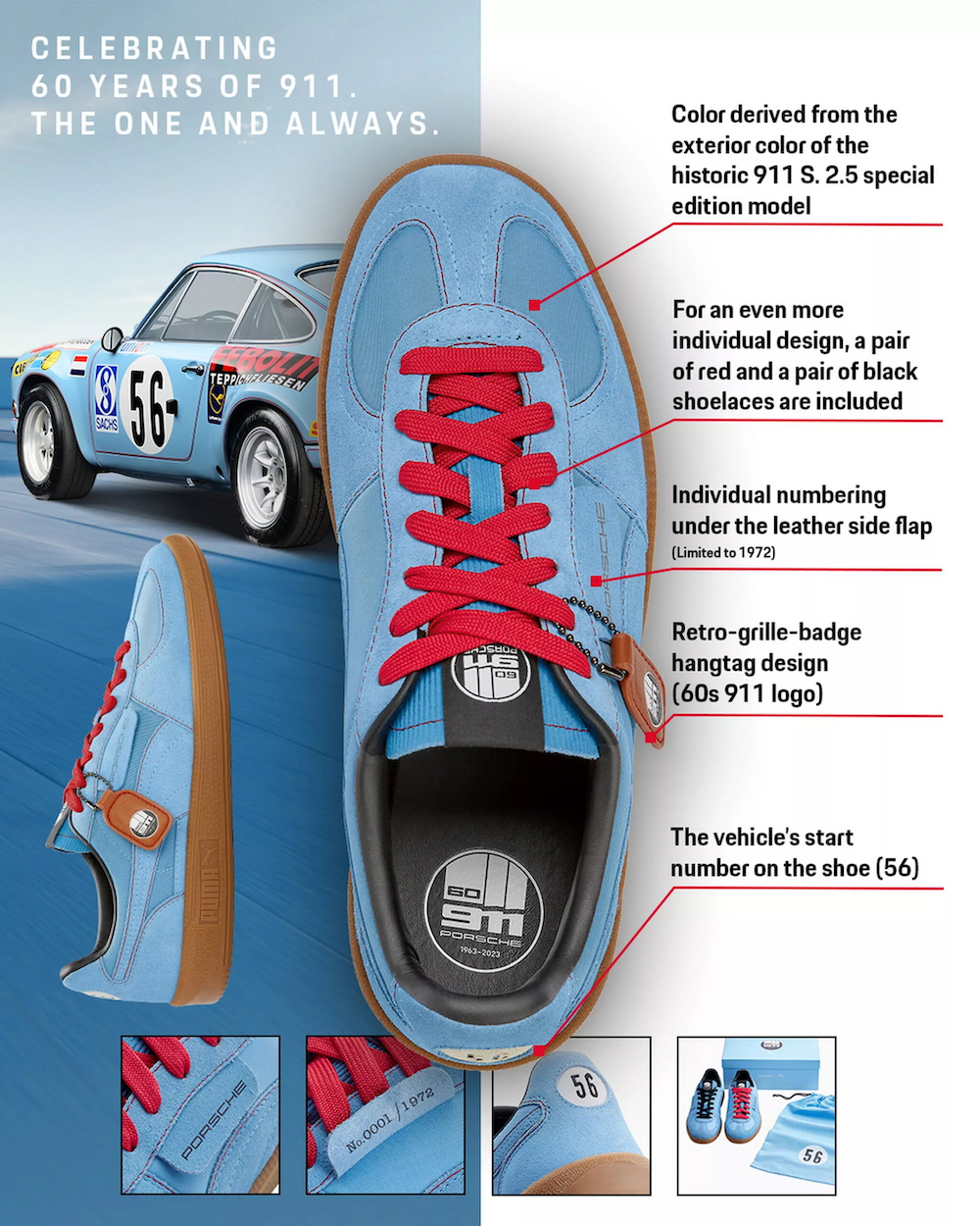 Kasut pertama berwarna biru lembut dengan profil lebih kecil yang mengambil ilham model Porsche 911 S(T). Setiap pasang kasut ini memaparkan angka 56 di belakang tumit.
