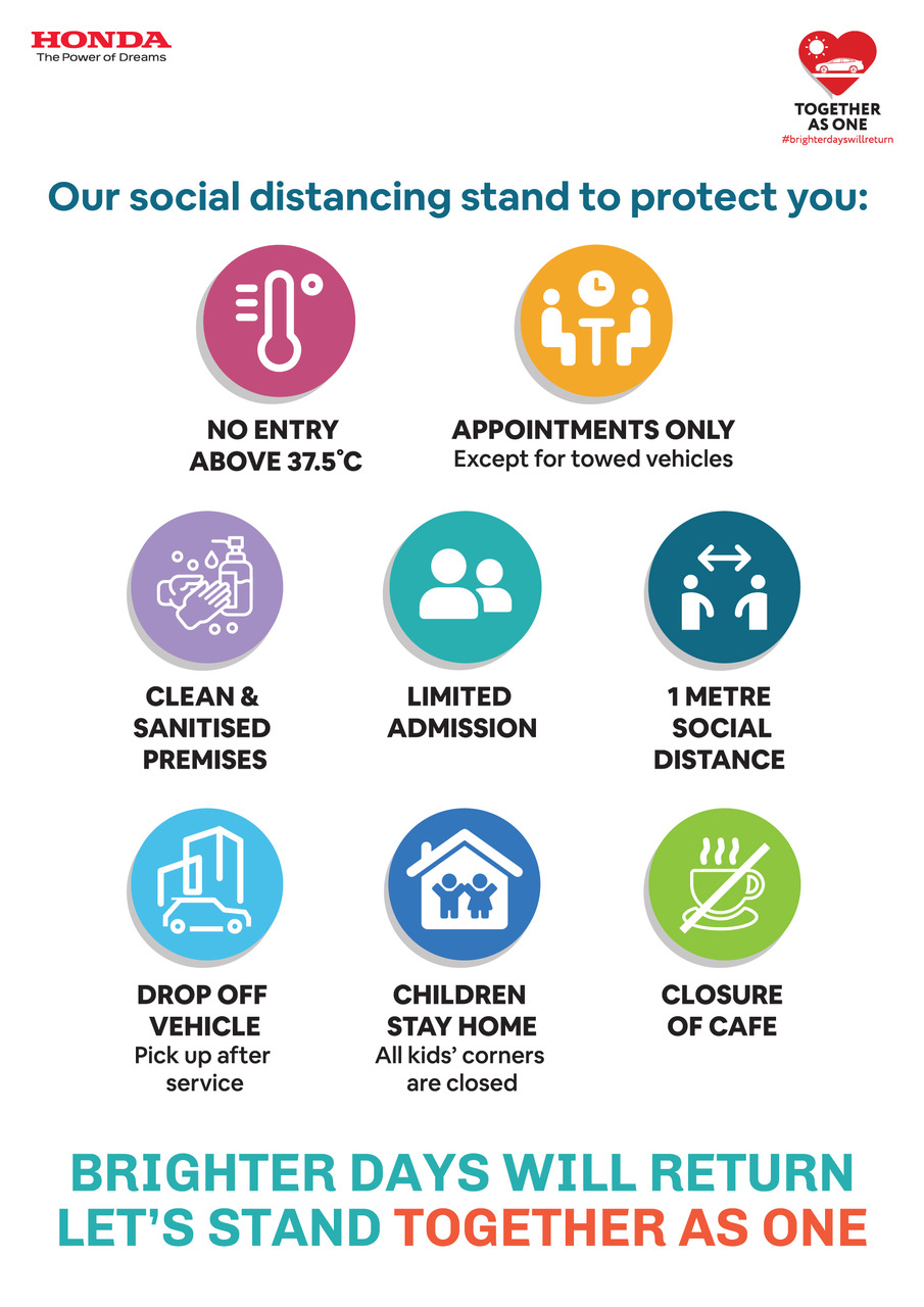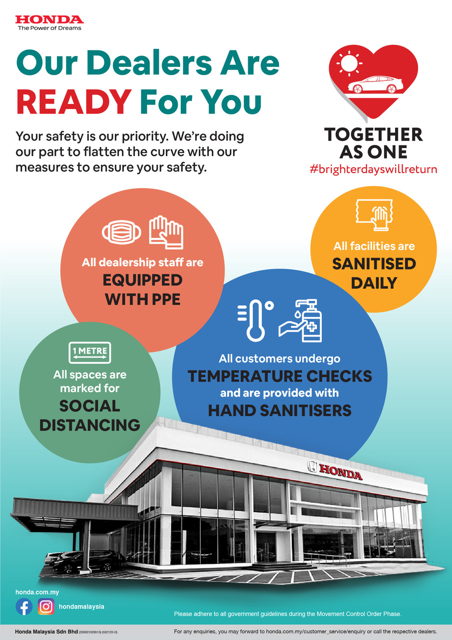 Honda Malaysia juga menegaskan akan mengambil langkah penjagaan serius di seluruh pusat servis dan jualan bagi melindungi keselamatan pelanggan dan kakitangan dengan mengikut panduan dan peraturan ditetapkan MITI dan badan berkaitan lain.
