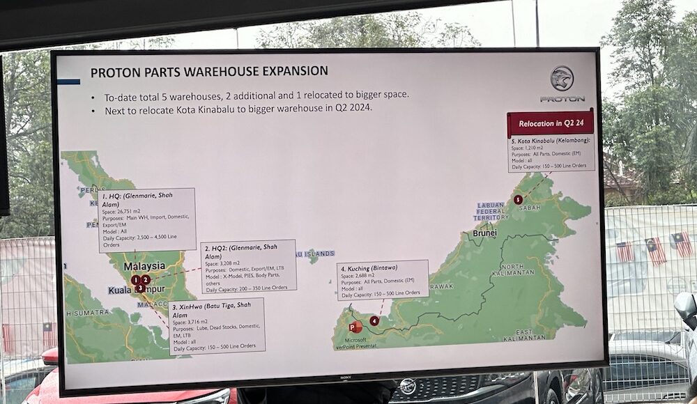 Roslan berkata, Proton ketika ini mempunyai lima gudang penyimpanan alat ganti, iaitu dua di ibu pejabat Glenmarie (Shah Alam), XinHwa (Batu Tiga, Shah Alam), Kuching (Bintawa) dan Kota Kinabalu (Kelombong).