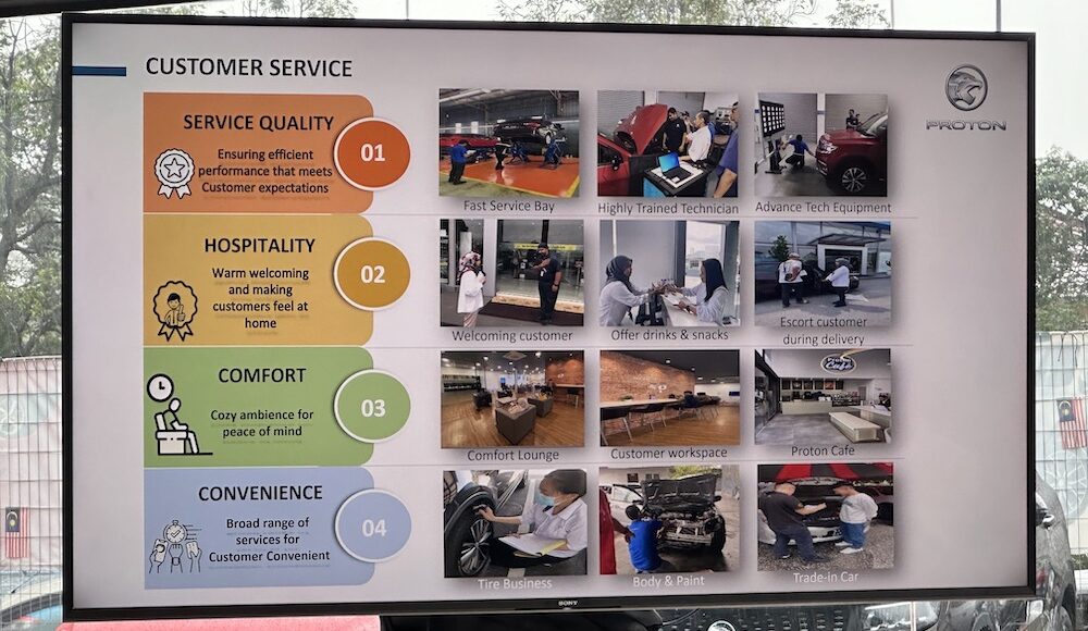 Mengenai kualiti Pusat Servis, Proton mahu memastikan prestasi yang efisien dalam menyediakan ruang servis pantas, pekerja dan juruteknik mahir serta menyediakan servis dengan peralatan teknologi maju seperti kalibrasi sistem bantuan pemandu aktif (ADAS Calibration).