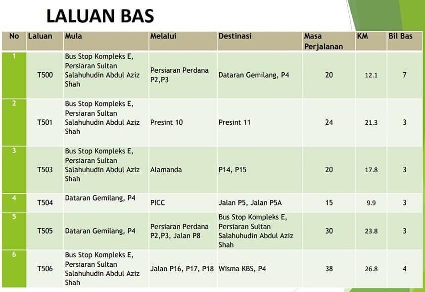 Melalui kawasan perumahan, komersial dan pejabat selain Presint 1 hingga Presint 4 dengan kekerapan setiap 15 minit pada waktu puncak, 20 minit pada waktu bukan puncak dan 30 minit pada malam, hujung minggu dan cuti umum.