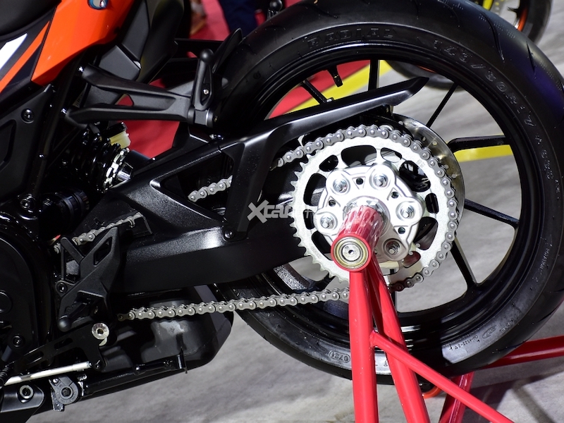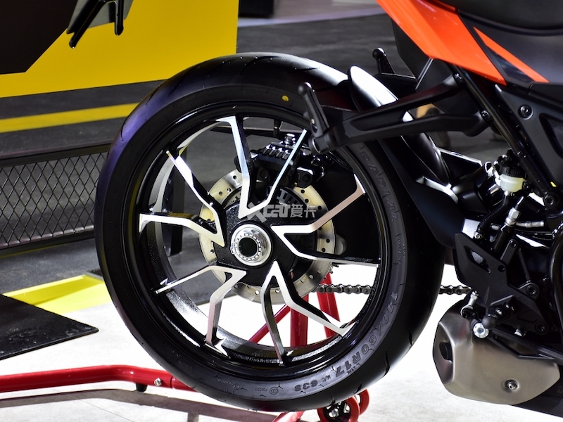 - Ada swingarm tunggal aluminium kompak yang membantu memendekkan jarak roda, dan turut memberikan sedikit kelebihan di litar. Rim sport dalam dwi-tona.