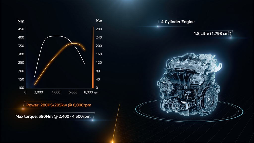 Ciri 4CONTROL memberikan ketangkasan hebat dan kestabilan membelok mengujakan dalam kelajuan tinggi. Segalanya mungkin dengan enjin pengecas turbo baharu 4-silinder 1.8L berkuasa 278hp @ 6,000rpm dan tork 390Nm @ 2,400- 4,500rpm dengan pilihan transmisi manual dan automatik. Pecutan 0-100kmj mampu dibuat sepantas 5.8 saat, manakala kelajuan maksimum 255kmj (250kmj untuk AT).