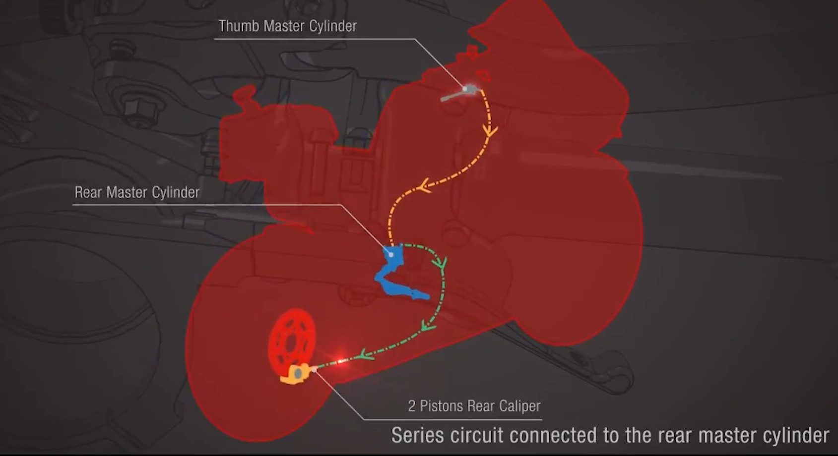 Kedua, sistem dengan dua saluran bendalir brek berbeza iaitu satu tuil untuk satu piston. Maknanya, tuil brek ibu jari akan menggerakkan satu piston dalam kaliper. Satu lagi piston akan bergerak jika penunggang menarik tuil brek tangan normal (gambar atas kanan).