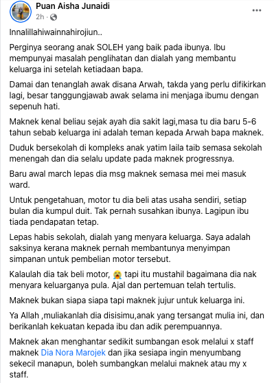 Dalam pada itu, tular pula cerita seorang lelaki di lokasi kejadian yang terhidu wangian kasturi ketika menghampiri jenazah mangsa. Pasti ada kebaikan yang dilakukan hinggakan pelbagai cerita baik dapat kita dengar. Al-Fatihah buat Yuhanis, moga arwah dicucuri rahmat. Amin.