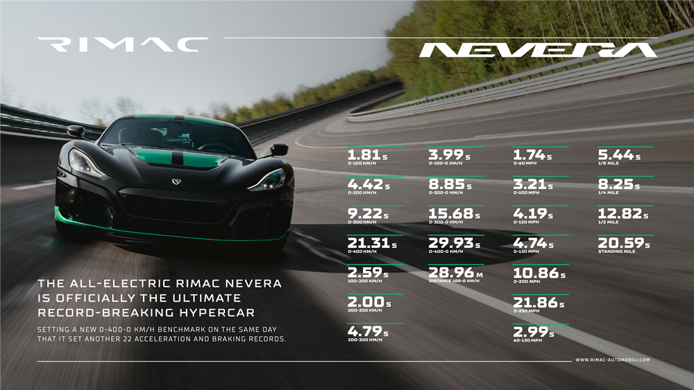 Rimac Nevera dijana empat motor berkuasa 1,914hp dan tork 2,360Nm dengan pecutan 0-100kmj dibuat di ATP sepantas 1.81 saat, manakala pecutan 0-400kmj sepantas 21.31 saat.