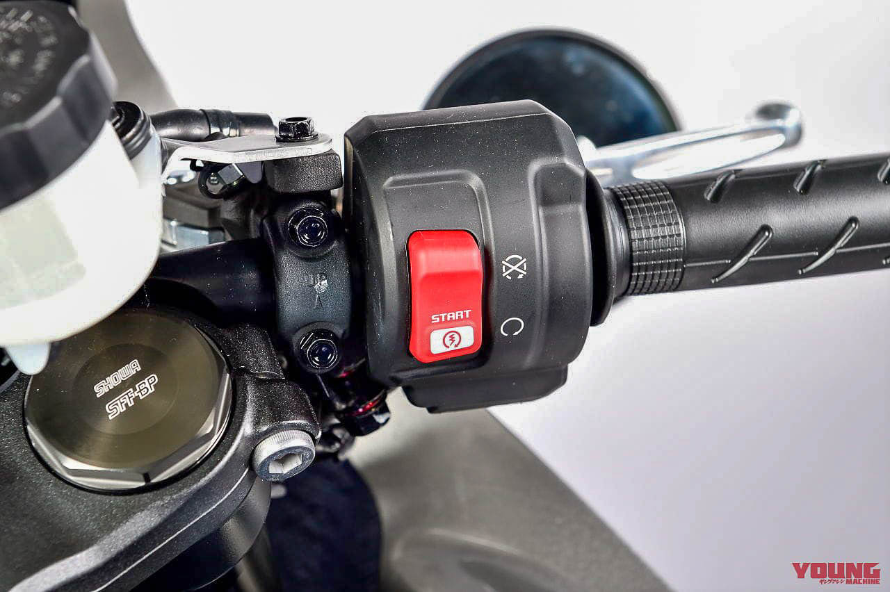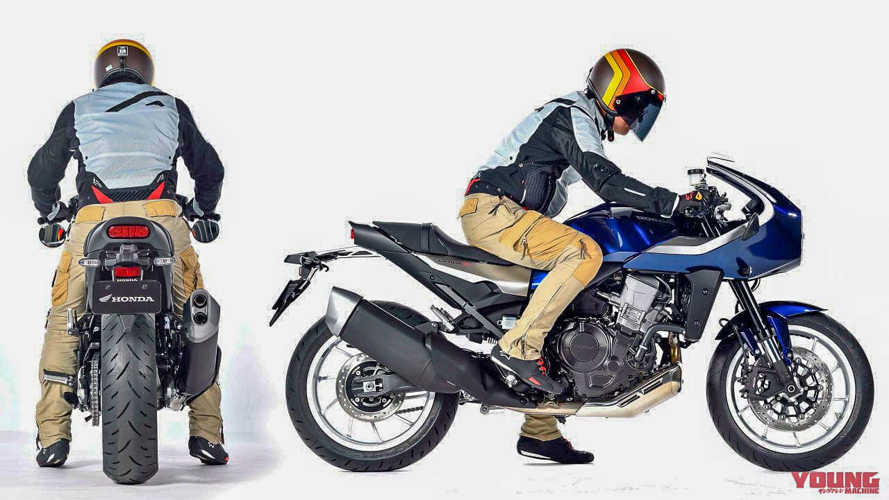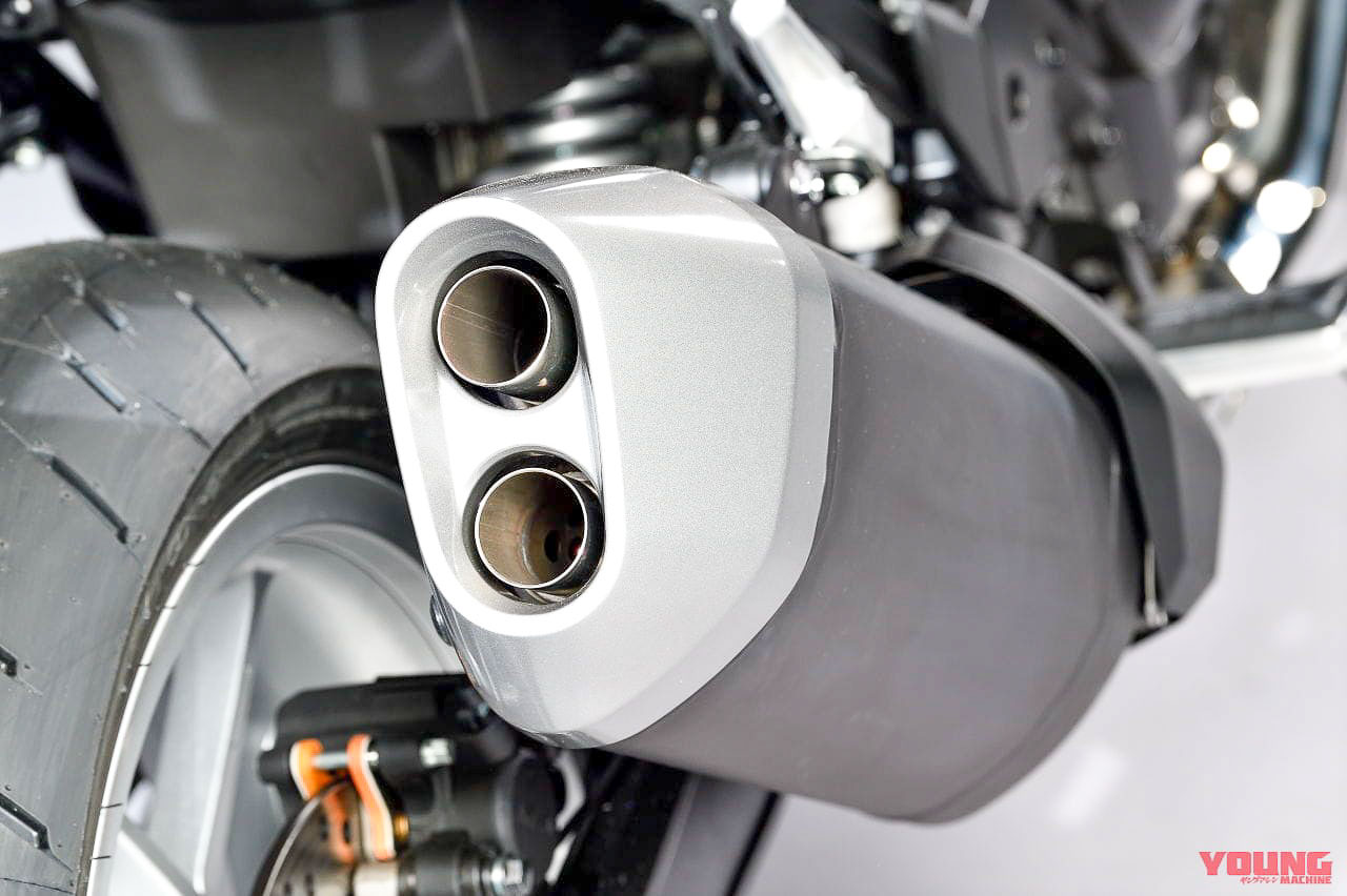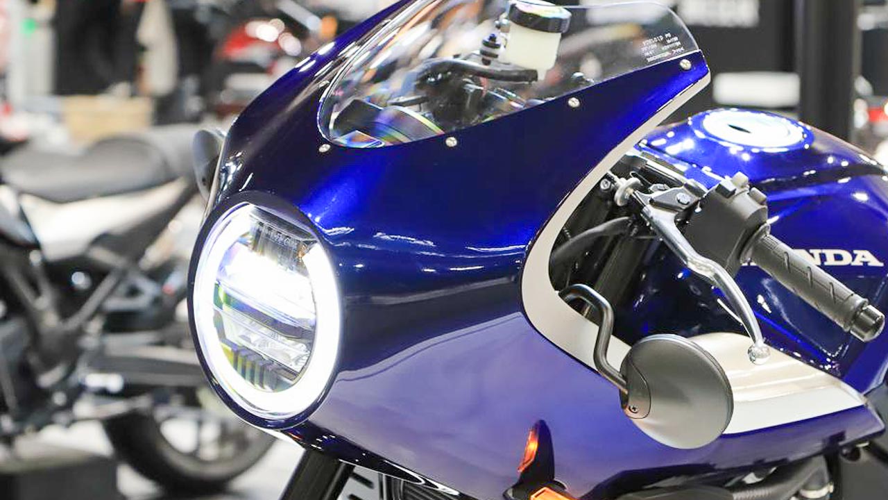 - Melengkapkan gaya cafe race ialah paip ekzos krom panjang yang merentang ke atas.