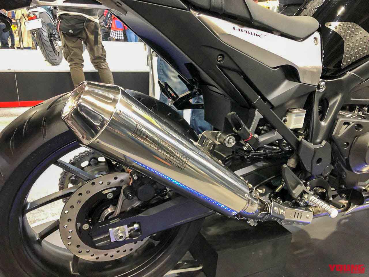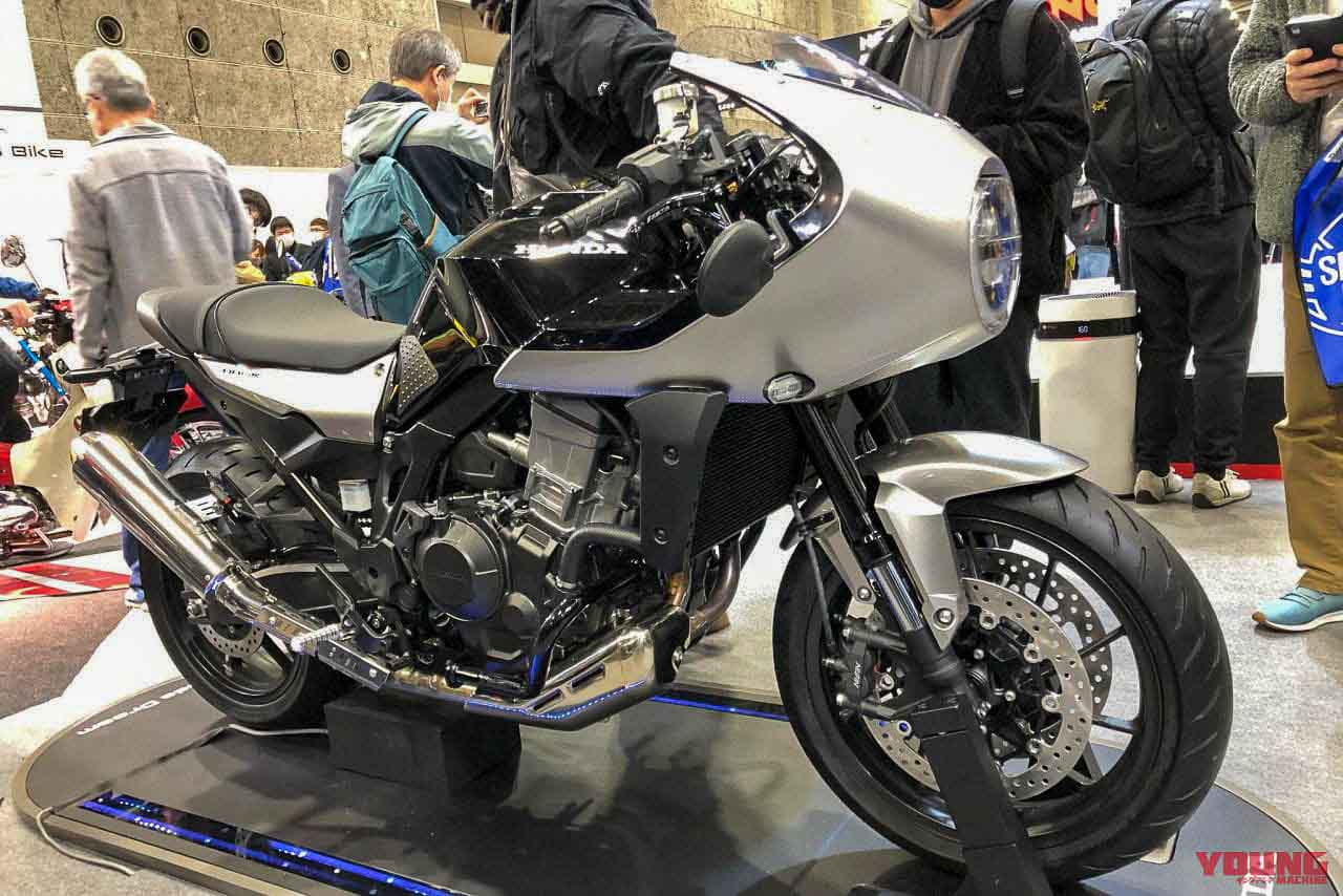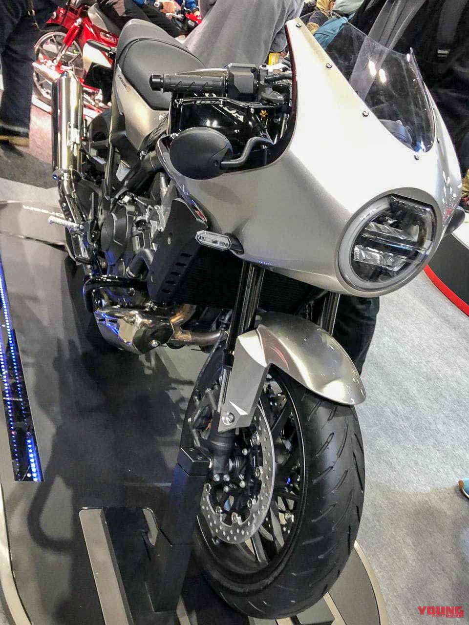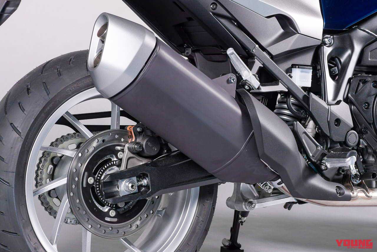 - Melengkapkan gaya cafe race ialah paip ekzos krom panjang yang merentang ke atas.