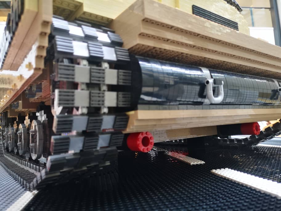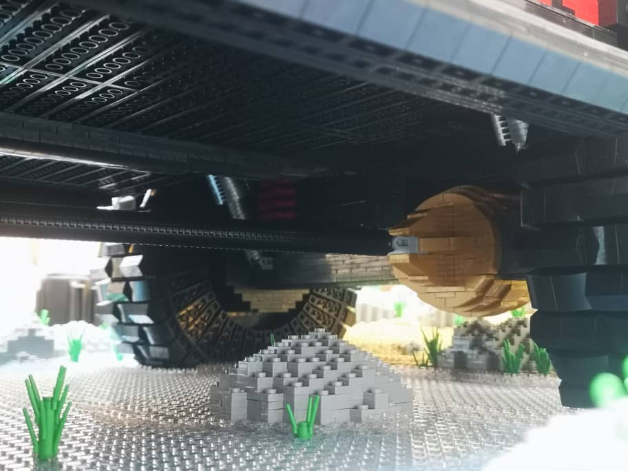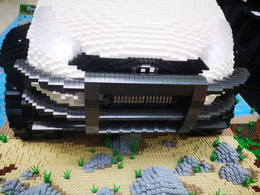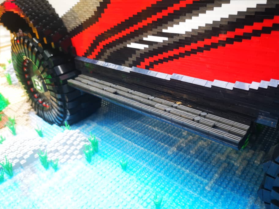 Replika kereta seragam putih-merah-hitam-kelabu ini menggunakan empat unit tayar blok saiz besar. Ada gandar dan rod syaf kustom, juga daripada bongkah plastik. Bahagian bumbung siap rel dan empat lampu sorot tambahan.