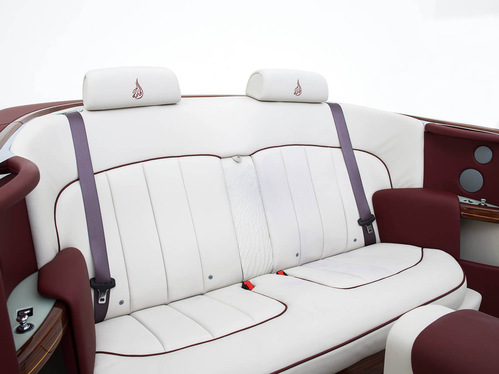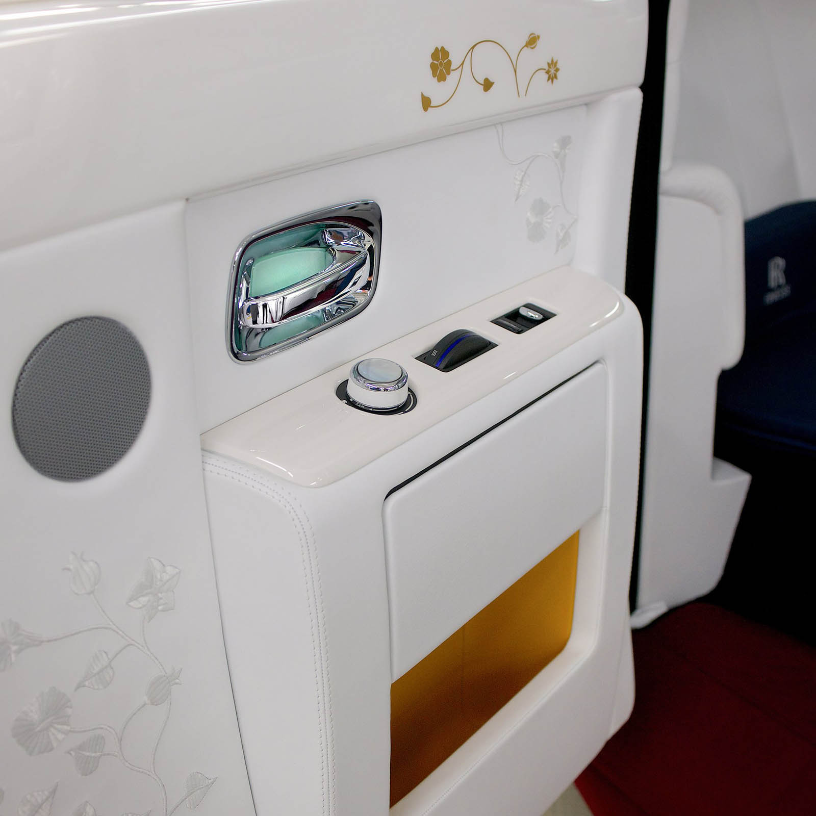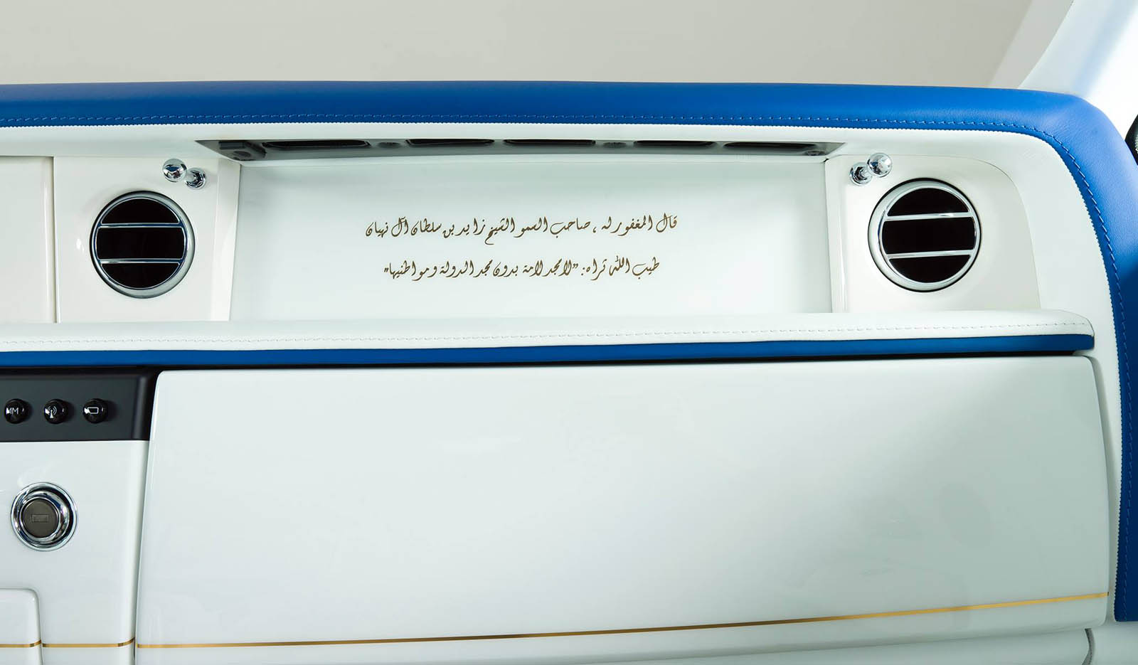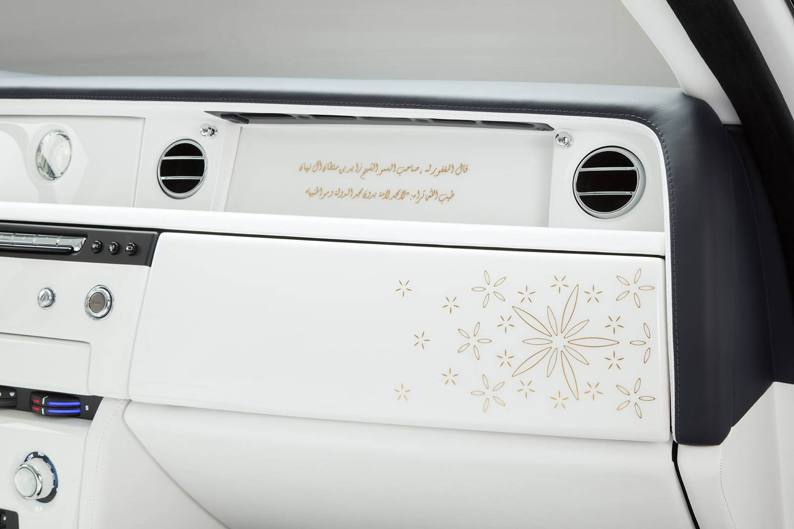 Rolls-Royce Phantom di atas diinspirasikan daripada rekaan Masjid Besar Sheikh Zayed sebagai antara mercu tanda utama di ibu kota Abu Dhabi. Badan kereta menampilkan warna cat dua tona, putih dan emas, manakala ruang dalaman diberikan kemasan sulaman bunga. Motif bunga halus dalam kabin itu dikatakan mengambil masa 800 jam membabitkan 400,000 jahitan untuk disempurnakan. Hasilnya, lihatlah sendiri.