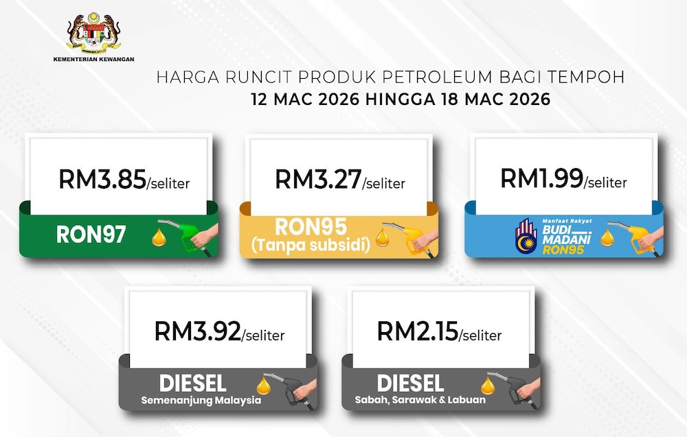 KERAJAAN mengumumkan perubahan harga runcit produk petroleum bagi tempoh 12 Mac hingga 18 Mac 2026, dengan kenaikan 60 sen bagi RON97 dan RON95 (tanpa subsidi), manakala diesel pula mengalami kenaikan 80 sen.
