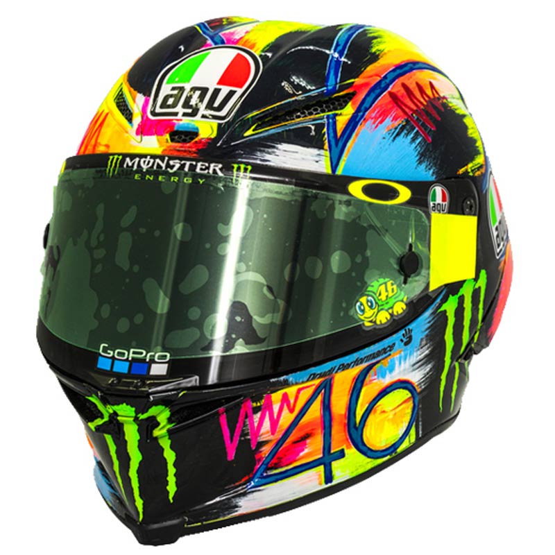 Padanan grafik matahari dan bulan yang memang simbolik dengan Rossi bersama latar warna kuning dan nombor keramat 46 tulisan tangan menggunakan berus nyata menyerlahkan imej si pemakai. Pasaran Jepun bakal melancarkan helmet ini pada musim panas tahun ini pada harga ¥215,000 (RM7,900).