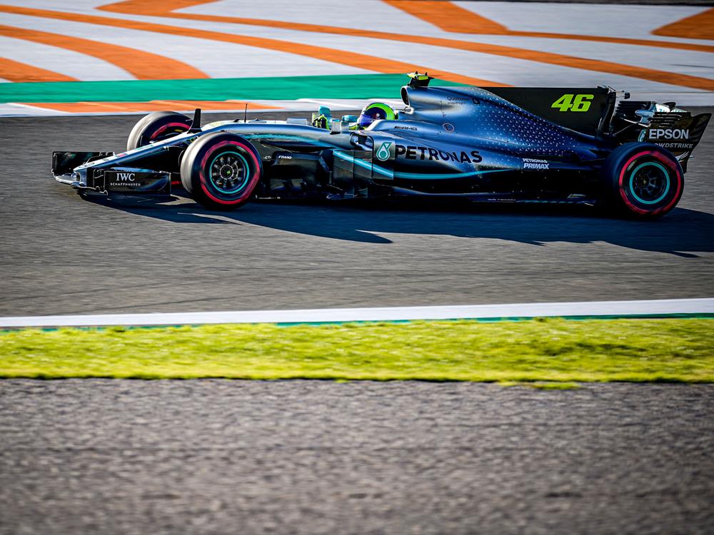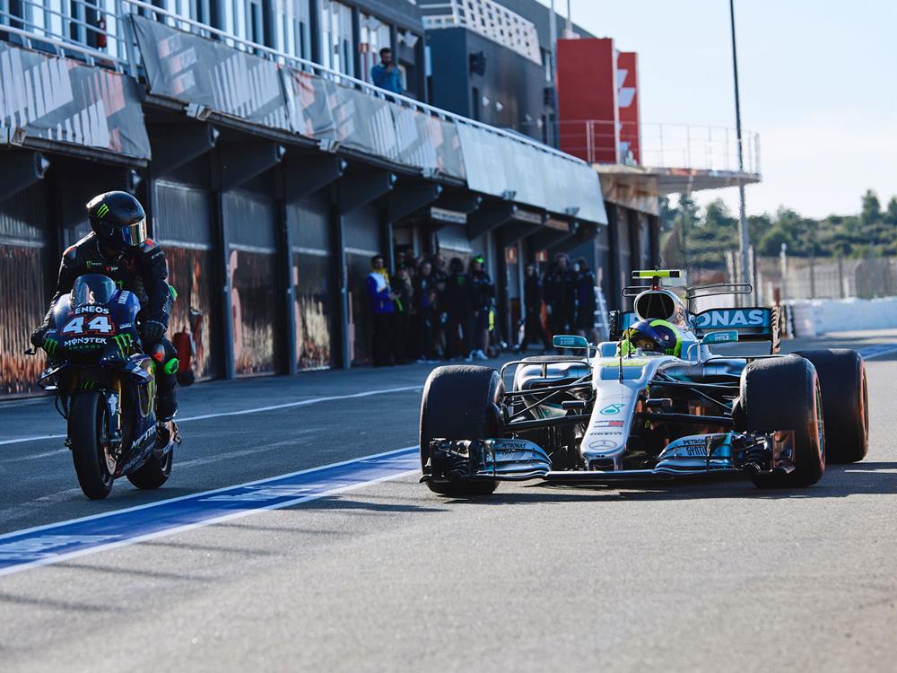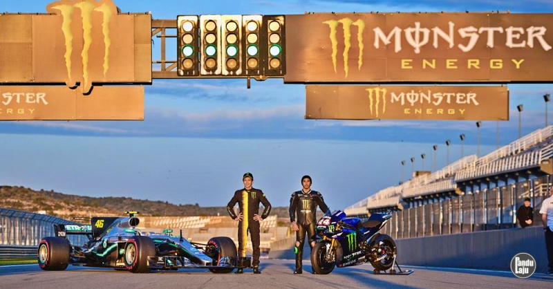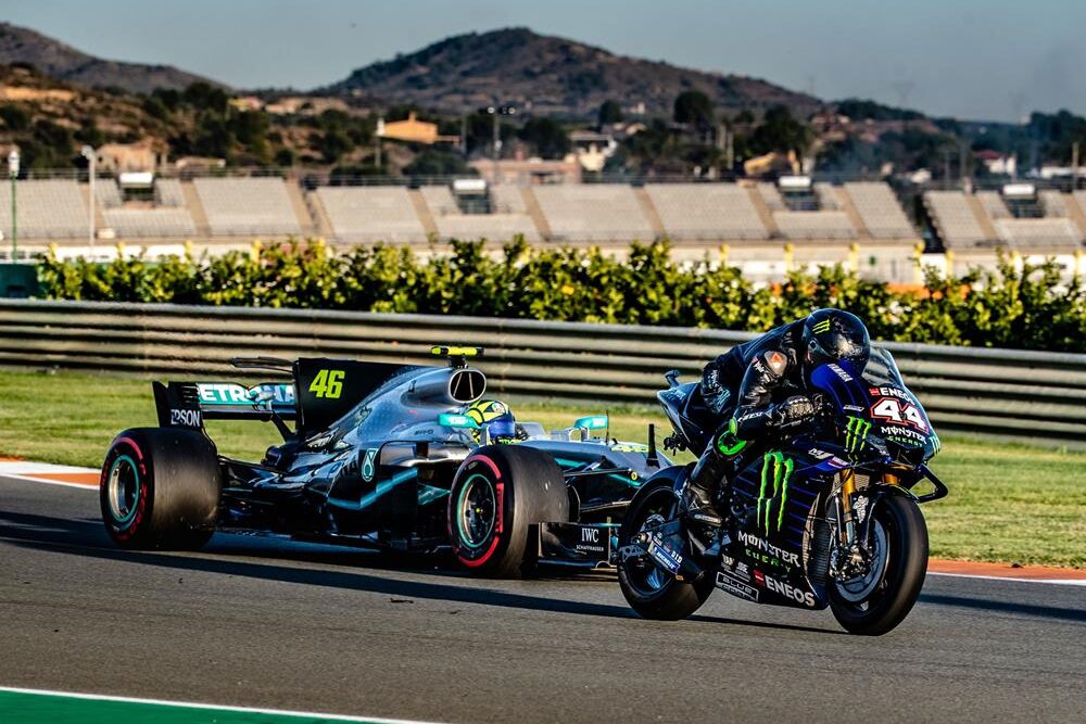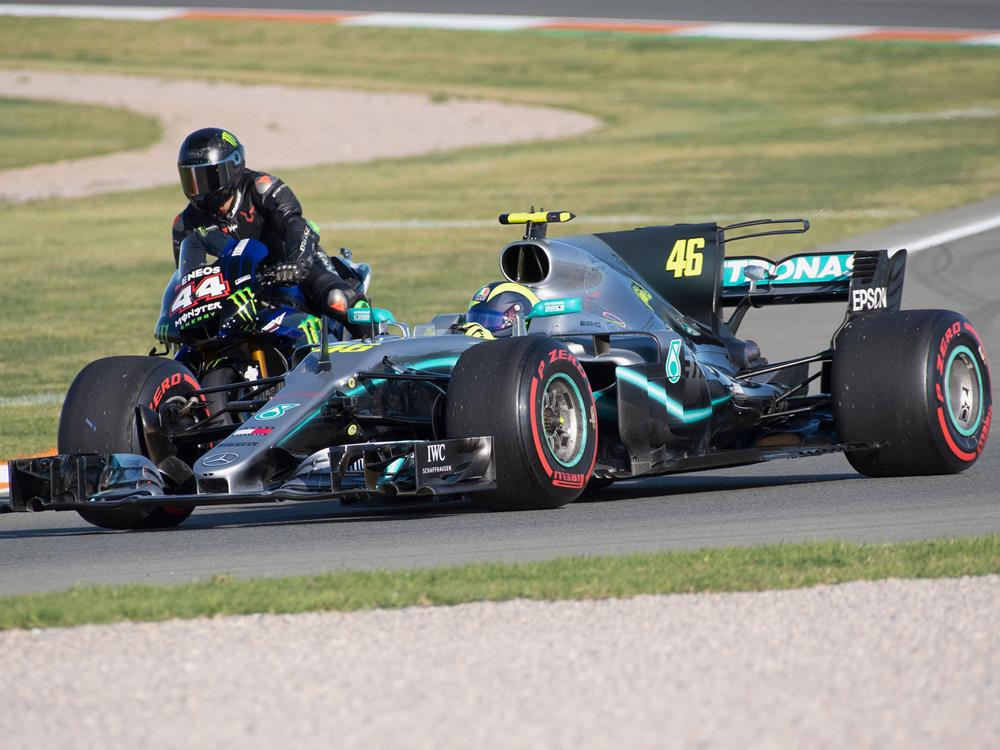 Rossi kekihatan memandu Mercedes W08 (2017), manakala Hamilton menunggang jentera milik Rossi tahun lalu, Yamaha YZR-M1 (2018).