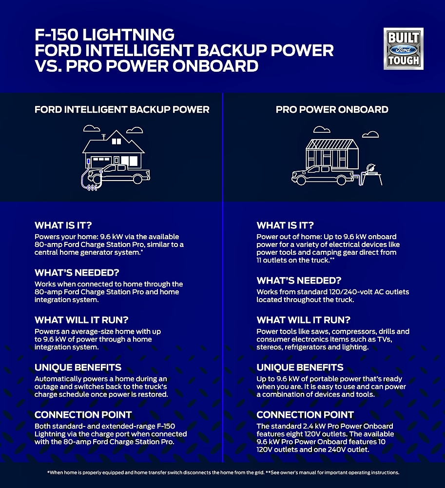 Pada masa depan, Ford bakal memperkenalkan fungsi yang menjadikan pemilikan F-150 Lightning lebih berbaloi. Sistem Ford Intelligent Power membolehkan pemilik menguasakan rumah dengan bateri daripada trak pikap ketika kadar elektrik tinggi dan mengecas kembali trak pikap apabila kadar elektrik rendah, atau menerusi panel solar atas bumbung rumah.
