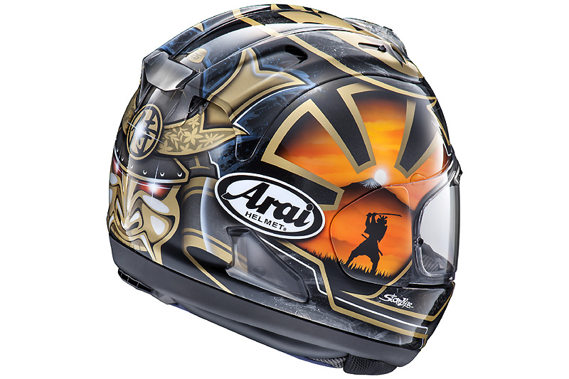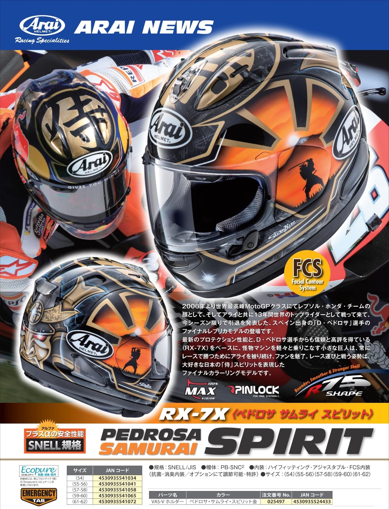 SEJAK 2006, Dani Pedrosa ialah imej pasukan Repsol Honda dan helmet Arai sudah jadi pilihan pelumba kelas premier itu sejak 13 tahun lalu. Susulan pengumuman persaraannya Julai lalu, Arai mengeluarkan model replika Pedrosa – RX-7X Pedrosa Samurai Spirit.