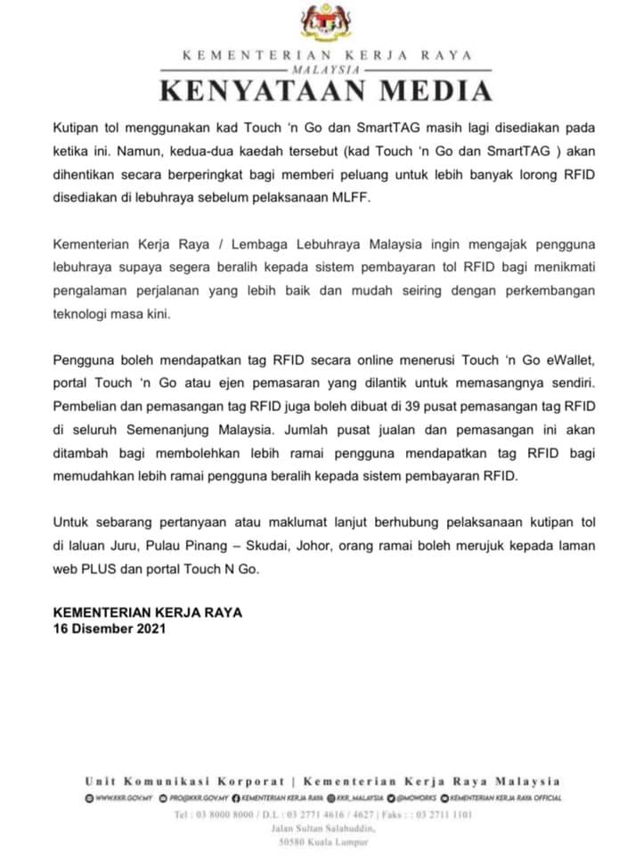 Dalam perkembangan lain, laluan Juru, Pulau Pinang dan Skudai, Johor di Lebuhraya Utara-Selatan (PLUS) akan melaksanakan sistem RFID bermula 15 Januari 2022.