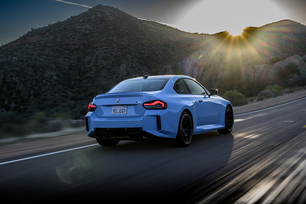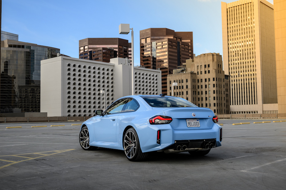 Seksyen belakang pula, BMW M2 (2023) didatangkan dengan lip spoiler untuk meningkatkan daya mendap aerodinamik, berserta difuser dan paip ekzos kembar M.