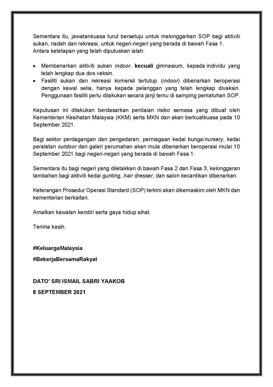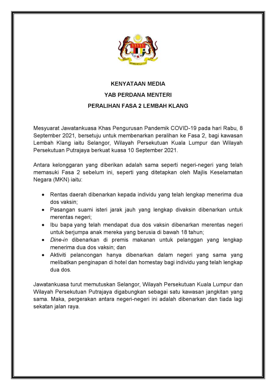 PERDANA Menteri, Datuk Seri Ismail Sabri mengumumkan peralihan Fasa 1 kepada Fasa 2 dalam Pelan Pemulihan Negara (PPN) untuk penduduk di kawasan Lembah Klang, melibatkan Selangor, Wilayah Persekutuan Kuala Lumpur dan Wilayah Persekutuan Putrajaya berkuat kuasa 10 September ini (Jumaat).