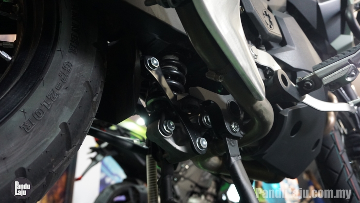 - Fork teleskopik di depan dan monoshock Uni-Trak di belakang.