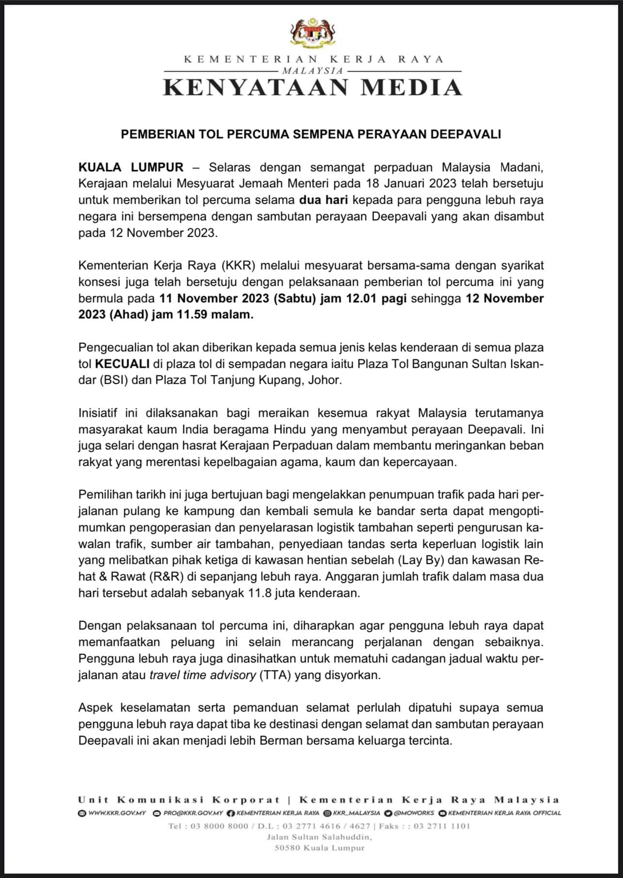 "Pengecualian tol akan diberikan kepada semua jenis kelas kenderaan di semua plaza tol KECUALI di plaza tol di sempadan negara iaitu Plaza Tol Bangunan Sultan Iskandar (BSI) dan Plaza Tol Tanjung Kupang, Johor.