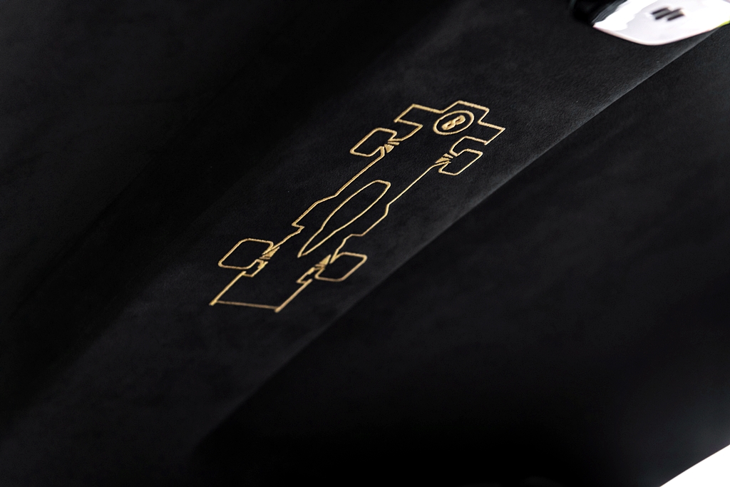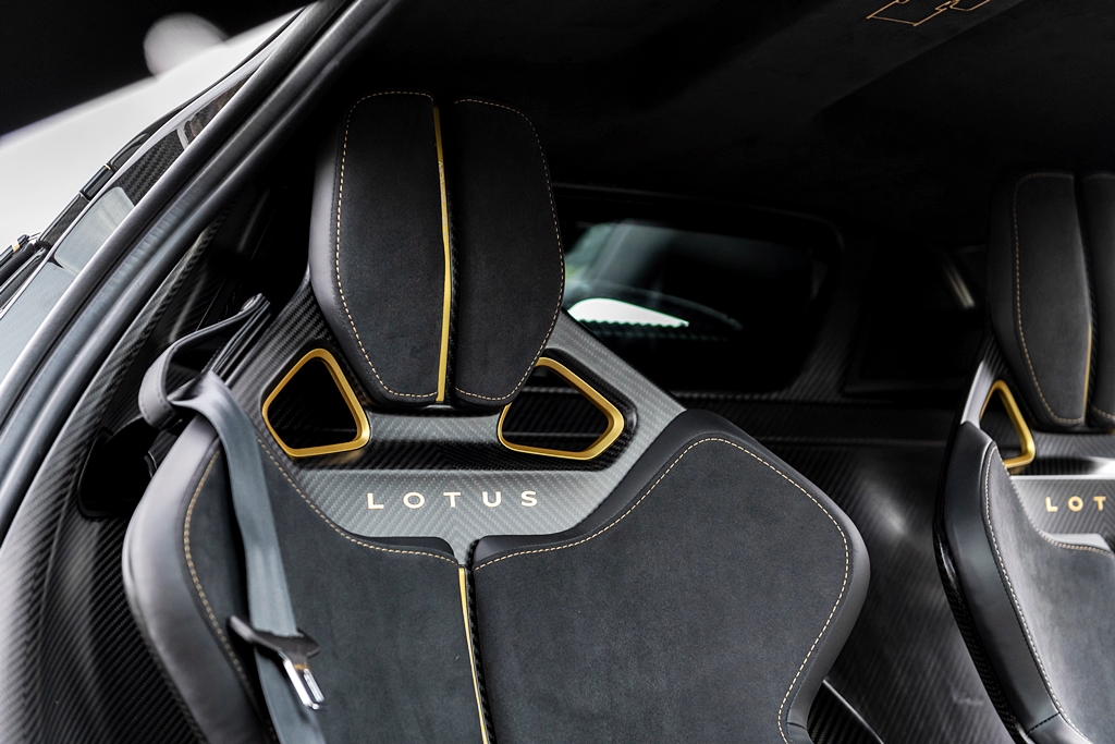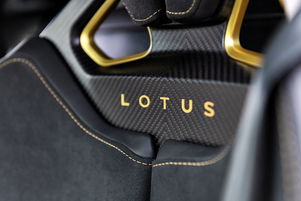 - Logo karbon dan emas Lotus pada muncung kereta.