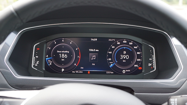 Seperti paparan foto atas kanan, perjalanan dua hari di Kuala Lumpur dan Selangor merekodkan jarak 186km, dan tangki minyak masih menawarkan jarak pemanduan hingga 390km. Kapasiti tangki minyak Tiguan ialah hampir 60 liter.