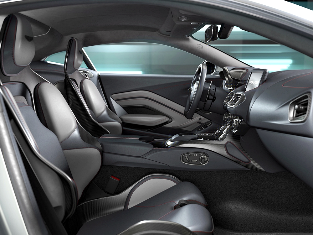 - Pilihan kerusi berprestasi gentian karbon dengan enam larasan manual. Kerusi dengan paten rekabentuk Aston Martin yang dipengaruhi model lumba dan penjimatan berat 7.3 kg.