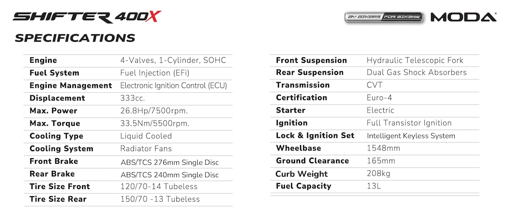 MODA Shifter 400X dikuasakan enjin 4-injap silinder tunggal 333cc SOHC penyejukan cecair dengan sistem suntikan bahan api elektronik (EFI) dan unit kawalan enjin (ECU).