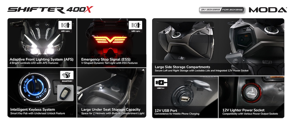 Ramai penunggang pasti tertarik dengan rekabentuk agresif dan ciri moden ditawarkan MODA Shifter 400X seperti: