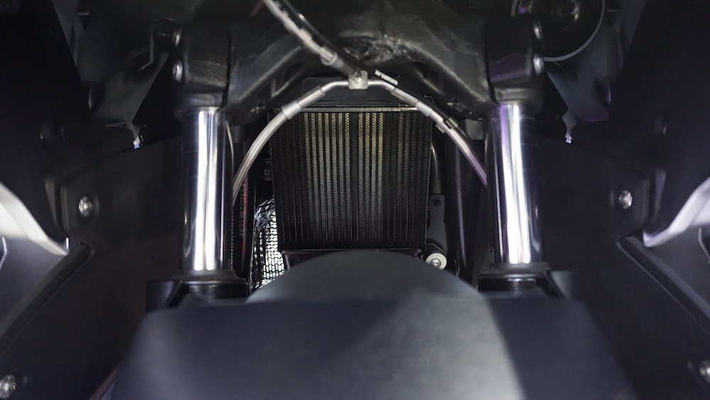- Fork teleskopik di depan dan monoshock di belakang yang diposisikan sebelah kiri yang dipautkan pada swingarm sebelah.