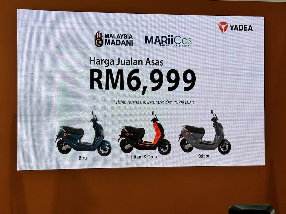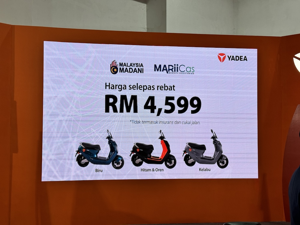 Jika layak, harga asas jualan selepas rebat YADEA G150 P akan turun kepada RM4,599 untuk pemohon yang layak. Model itu dijangka memasuki pasaran Malaysia bermula Ogos ini.