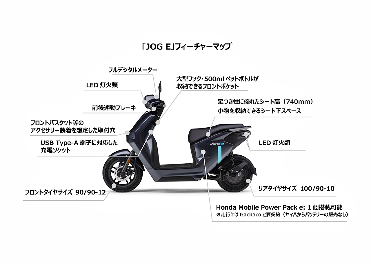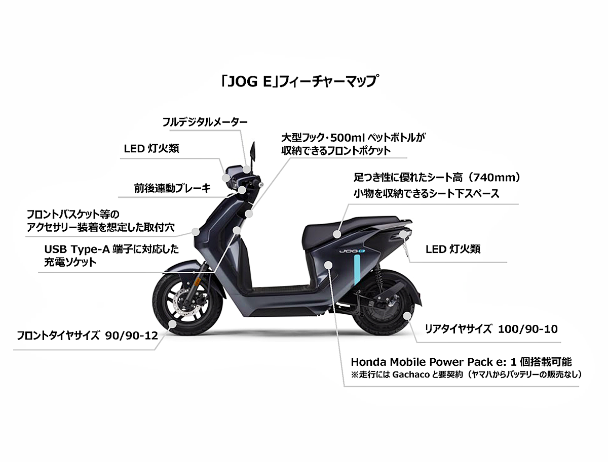 Yamaha JOG E 2026 ialah skuter elektrik kelas moped yang menggunakan pek bateri boleh tukar Honda Mobile Power Pack e:. Pelancaran awal itu hanya melibatkan jualan unit badan JOG E sahaja yang mana pelanggan diwajibkan membuat kontrak berbayar dengan perkhidmatan perkongsian bateri disediakan Gachaco.