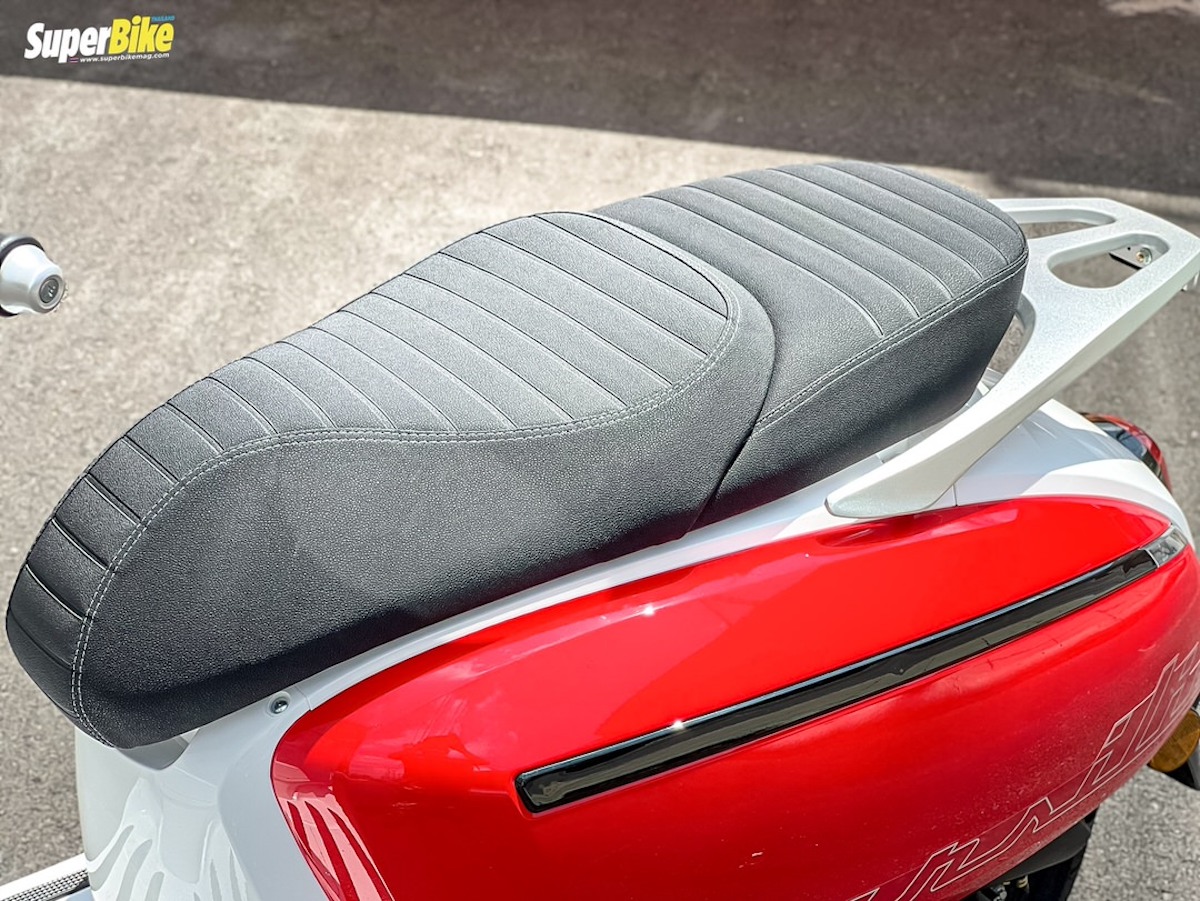 - Pelana panjang dalam dua bahagian untuk penumpang dan pembonceng.