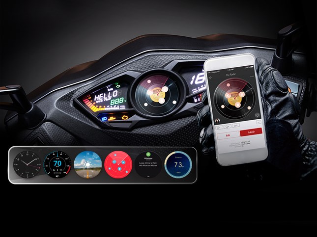 - Panel meter LCD digital berwarna dan boleh disambungkan kepada telefon pintar menggunakan konektiviti wayarles Bluetooth untuk memaparkan maklumat tunggangan, notifikasi panggilan dan mesej, serta menukar tetapan tema paparan.