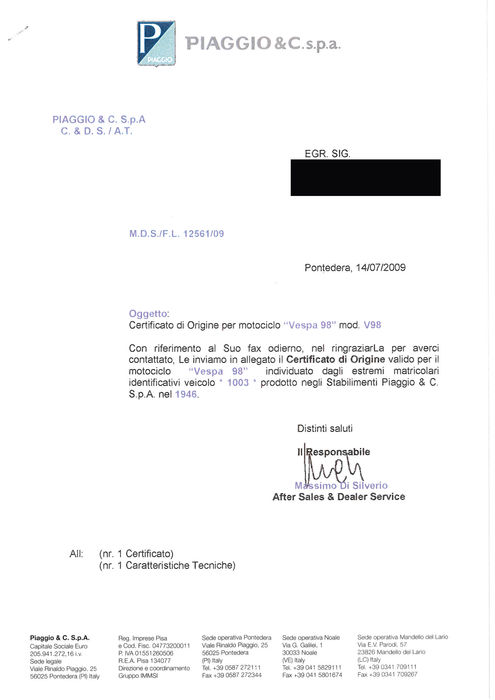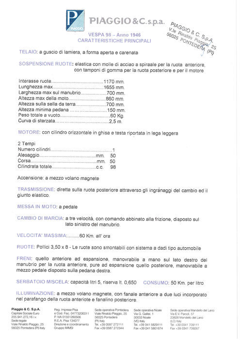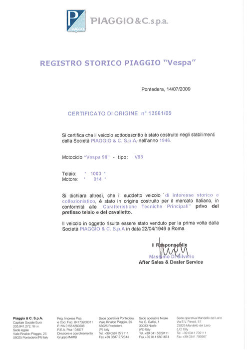 Berdasarkan dokumentasi sejarah, skuter ini satu daripada tiga Vespa Serie 0 yang dihasilkan. Dua beradik lain sudah lama hilang ditelan sejarah, manakala dilelong ini sudah pun dibaik pulih sepenuhnya dengan menanggalkan cat asal bagi menunjukkan metod pembinaan awal skuter berkenaan yang membabitkan kerja mengetuk dan mengimpal menggunakan tangan.