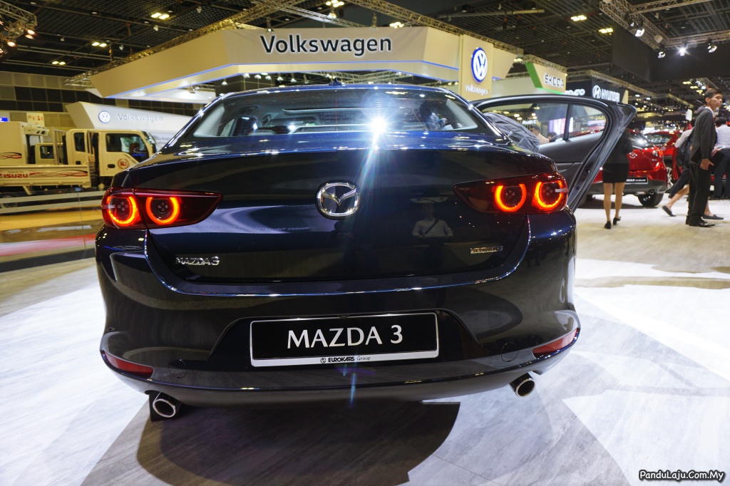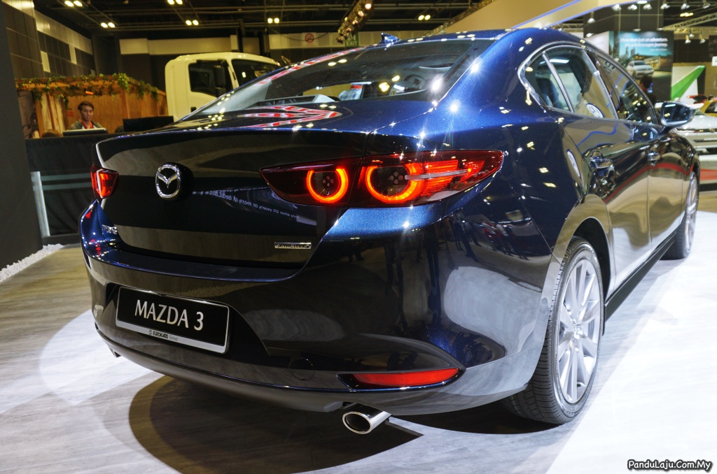 Bawah bampar belakang kelihatan ekzos kembar dan perkataan Mazda3 dengan fon baharu berbanding versi lama. Dimensi sedan dipertingkat berbanding model terdahulu dengan panjang 4,662mm (bertambah 82mm), lebar 1,797mm (+2mm) dan tinggi 1,445mm (+5mm), manakala jarak roda dipanjangkan 25mm kepada 2,725mm.
