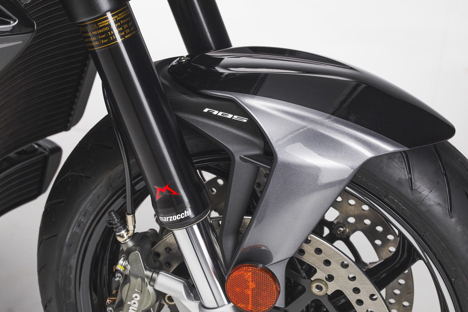 - Sistem brek menggunakan dwi-cakera 320mm dan cakera tunggal 220mm di belakang yang kedua-dua diapit kaliper Brembo.