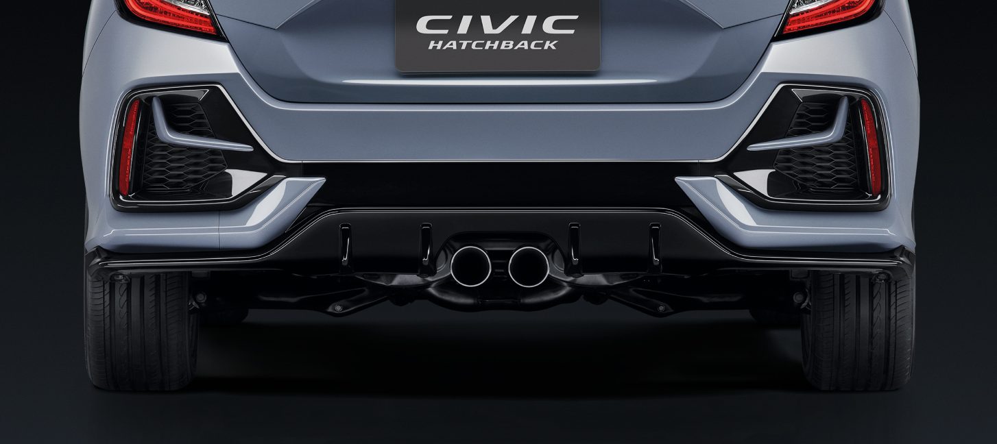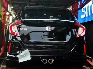 Melihat foto model atas trak di atas, nampaknya itu ialah Civic hatchback facelift hitam. Ini mudah dicam menerusi ekzos baharu jenis kembar di tengah ala Civic Type-R. Bezanya, bukan tiga paip seperti Type R. Jika dibandingkan versi Thailand, perubahan bukan hanya pada mufler.