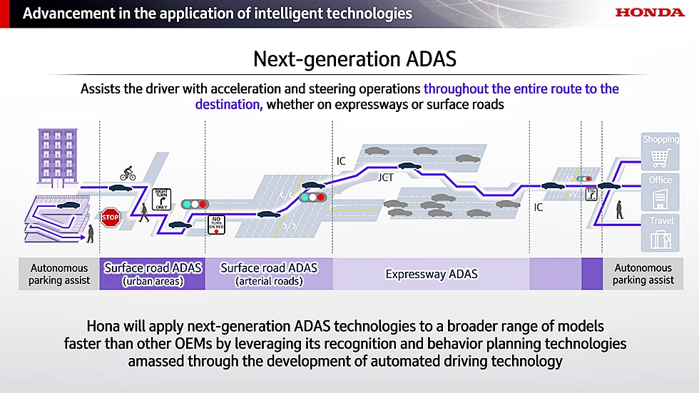 Salah satu tonggak strategi Honda adalah teknologi sistem bantuan pemandu termaju (ADAS) yang lebih pintar dan responsif. Sistem baharu itu akan direka untuk membantu pemandu di pelbagai persekitaran, dari lebuh raya hingga bandar kompleks dengan kawalan penuh terhadap pecutan, pembrekan dan stereng sepanjang laluan.