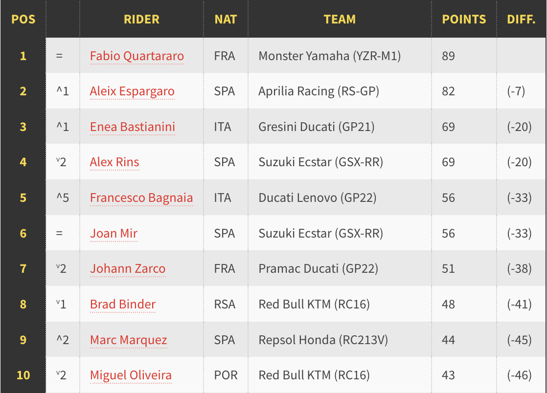 Quartararo menamatkan saingan di tempat kedua di Litar Jerez, di depan Aleix Espargaro (Aprilia), manakala tempat keempat menjadi milik juara dunia MotoGP enam kali, Marc Marquez. Rakan sepasukan Bagnaia, Jack Miller akhir dengan kedudukan tempat kelima dengan mengumpul 11 mata.