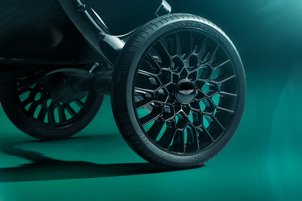 Butiran rekaan automotif lain juga jelas kelihatan. Roda stroler diilhamkan daripada corak sarang lebah yang terdapat pada model Valour dan Victor, manakala elemen grafik pada hab roda merujuk kepada tombol kawalan dalam kokpit Aston Martin.