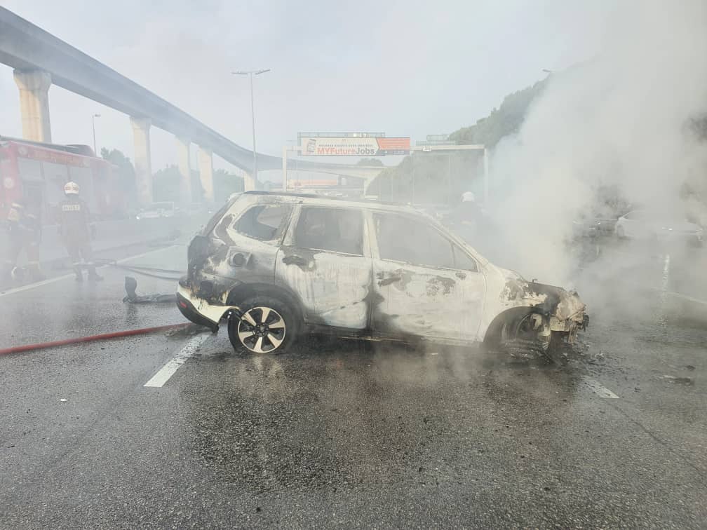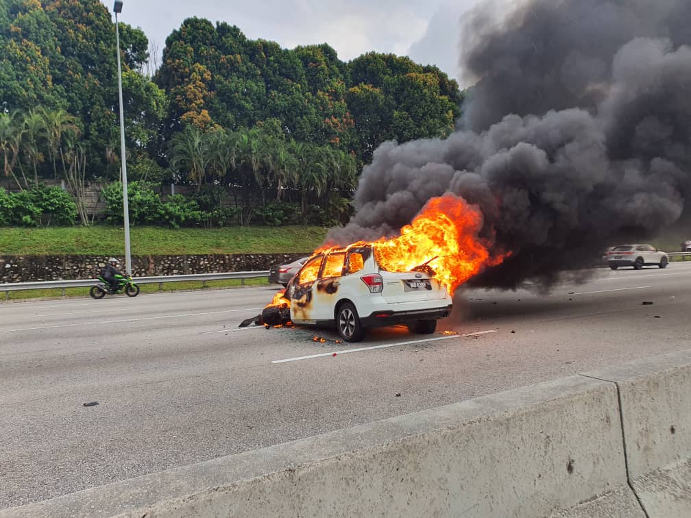 SEBUAH kenderaan utiliti sukan (SUV) jenis Subaru Forester berwarna putih dilaporkan terbakar selepas terbabit dalam satu kemalangan di Lebuhraya Shah Alam (KESAS) pagi tadi.