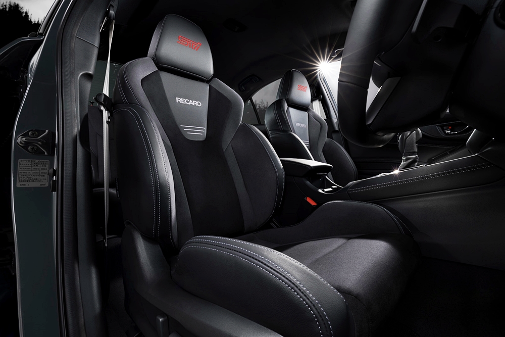 - Kerusi depan RECARO balutan Ultrasuede dan kulit tiruan (leatherette) dengan sulaman benang perak dan logo STI.