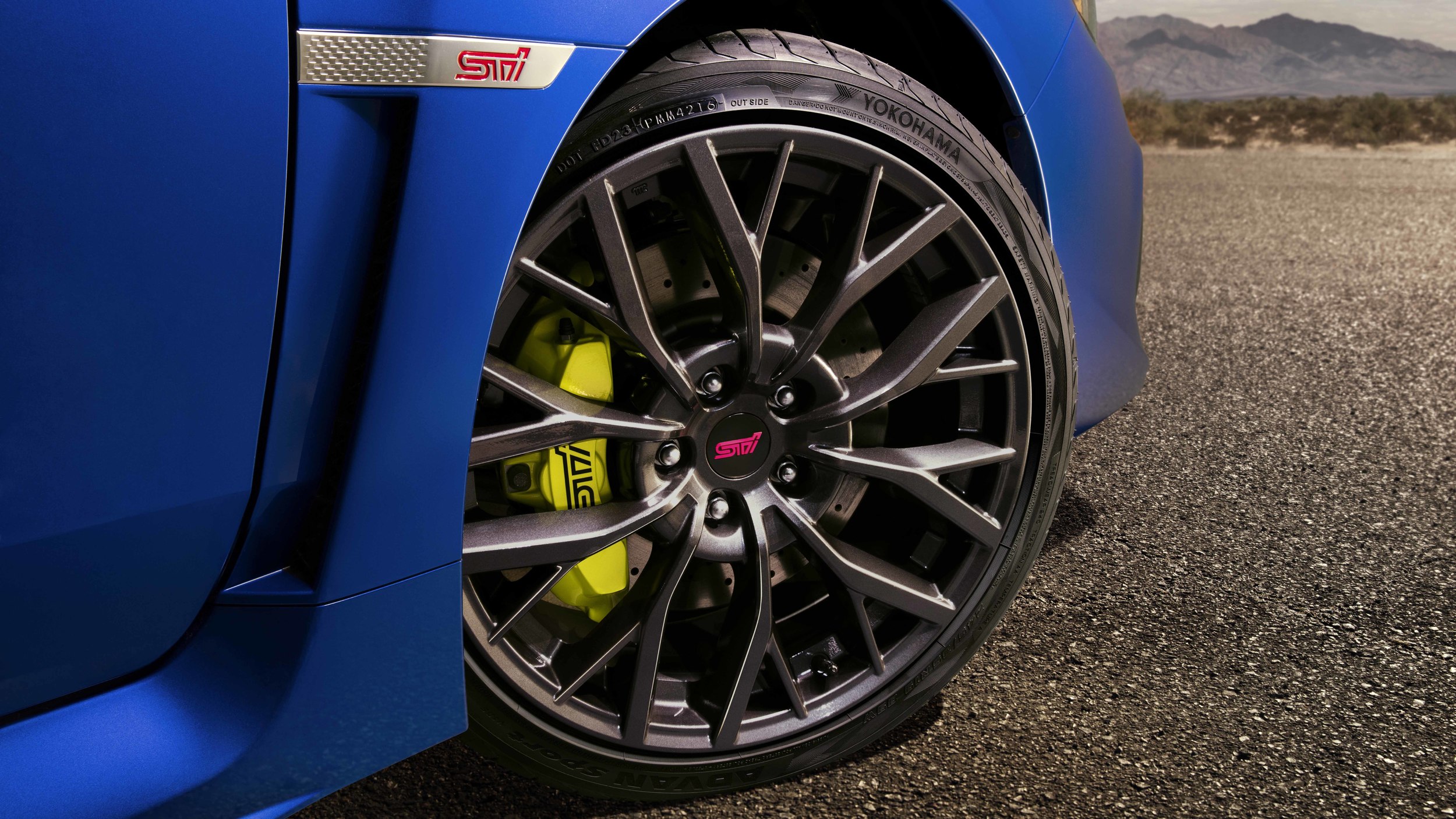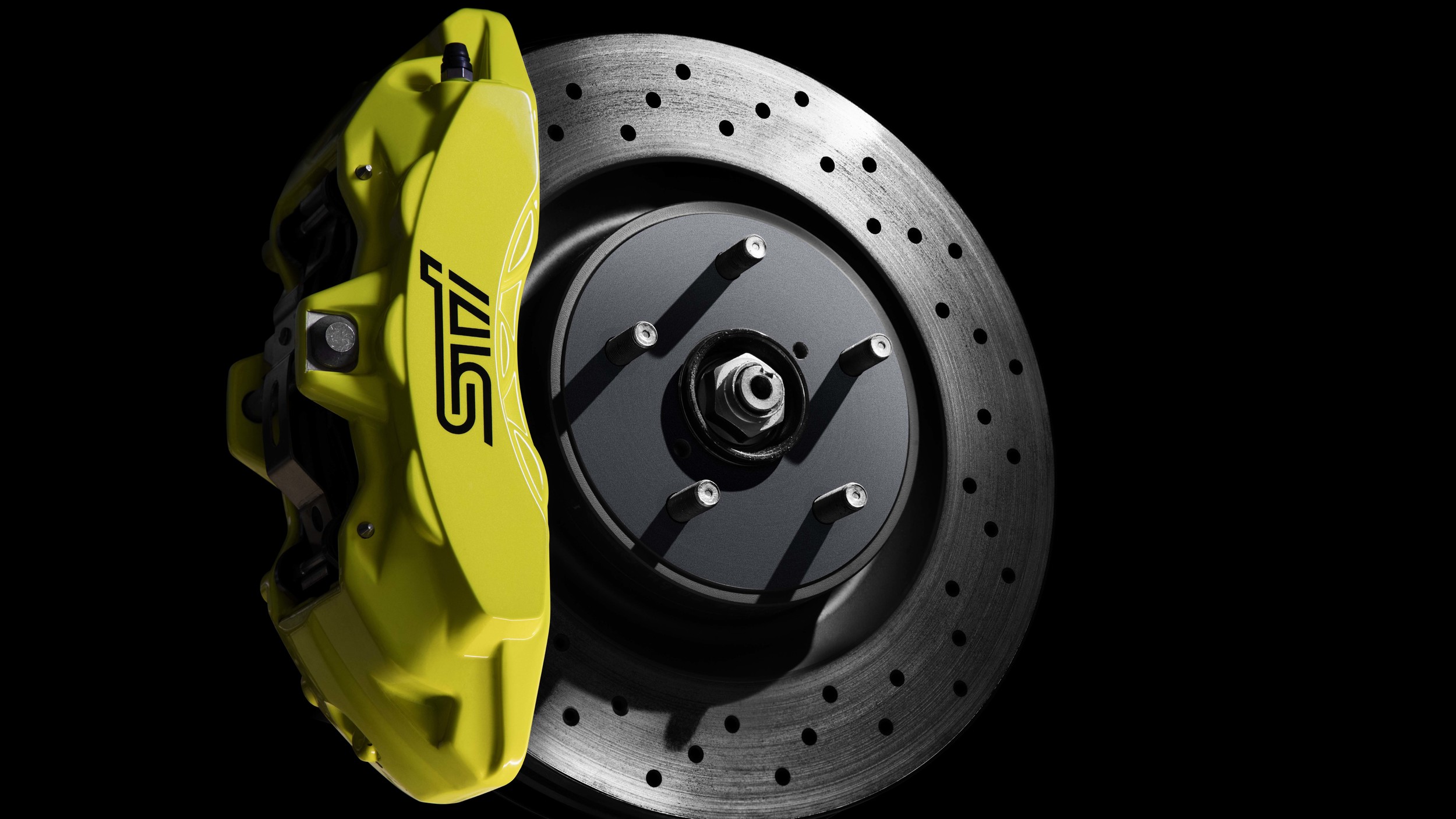 Brek pada model STI juga mendapat penambahbaikan menerusi penggunaan brek Brembo dengan kaliper 6-piston di depan dan 2-piston (belakang) berwarna kuning terang yang bekerjasama dengan rotor berlohong bersaiz besar dan pad brek yang juga besar.