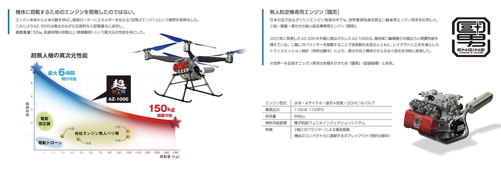 Super dron itu mampu mengangkat beban seberat 150kg dan terbang hingga enam jam di udara. Pemilih trenkuasa Suzuki dibuat kerana faktor berat yang dikelas sebagai ringan (lightweight), selain rekabentuk enjin dan lokasi syarikat berhampiran kilang Suzuki di Hamamatsu.