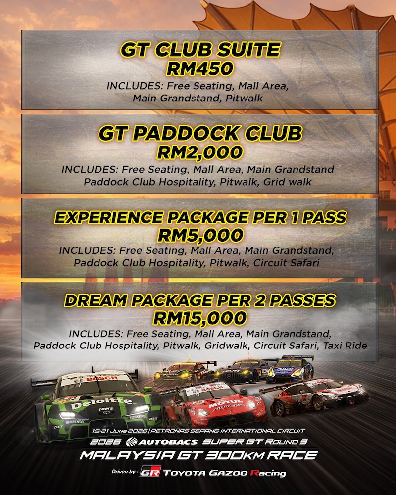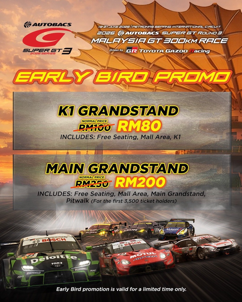 Menariknya, promosi pembeli awal (early bird) membolehkan peminat menyaksikan aksi kelas GT utama Jepun pada harga serendah RM80.