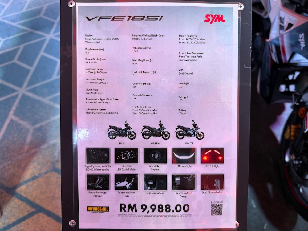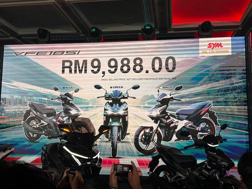 SYM VFE 185i dijual pada harga RM9,988.00, tidak termasuk insurans dan cukai jalan, dalam tiga warna pilihan: putih, hijau dan biru.